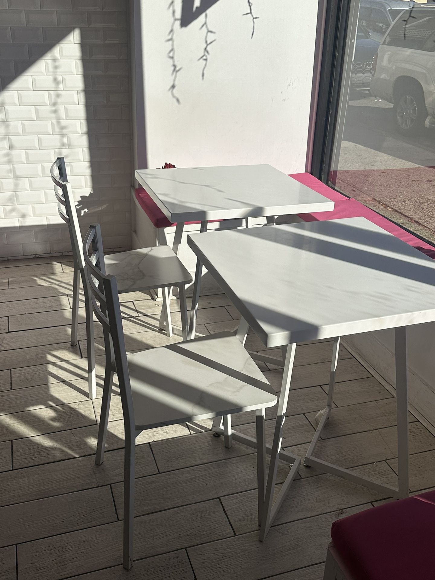 | Product Features | 2 white square tables with 2 white chairs | ||