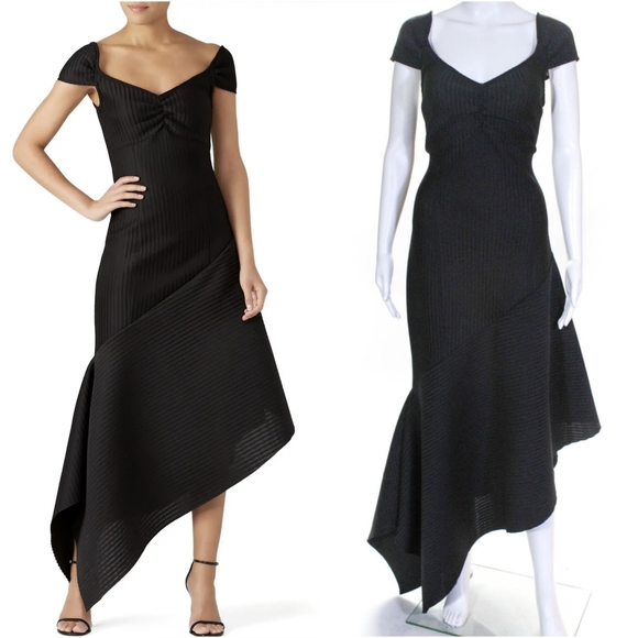 | Product Features | A billowing asymmetrical ruffled hem adds playful movement and dimension to every step you take in this elegant gown from Opening Ceremony. Worn once, like new and ready to make another statement. Black jersey (100% Polyester). Hourglass. Cap sleeves.V-neck sweetheart neckline. Hidden back zipper with hook-and-eye closure. 38" from shoulder to shortest hemline, 60" from shoulder to longest hemline. | ||