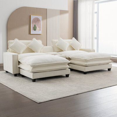 | Product Features | Details:Two USB Port and Two Cup Holders - This sofa with USB charging ports ans two cup holders is a modern piece of furniture that combines comfort and functionality. Its USB charging ports provide rechargeable convenience for charging smartphones, tablets and other electronic devices. Two convenient cup holders located within reach allow you to keep your favorite beverage close at hand without having to get up from your seat. This feature is perfect for you to relax and enjoy your favorite drinks. Large Storage Space - This sofa features large hidden storage space, providing you with convenient and easily accessible storage space for remote controls, magazines, and other essentials. Two Removable Ottoman - The sofa equips with two convenient and versatile removable ottomans, allowing you to customize your seating arrangement according to your preference and needs. Use it as a footrest, extra seating, or as a chaise lounge extension for ultimate relaxation. 4 Pillows Attached - These pillows add a touch of warmth and elegance to the sofa, which can be used as a waist pillow and add an extra layer of comfort to you. Durable&Breathable Material - The cushion is wrapped with durable, breathable and non-pilling chenille fabric, which not only ensures longer use time but also is friendly to pets. Double Cushion Design - The double cushion design gives you a more comfortable sitting experience. You can sit on the sofa to relax after a long day's work. Plus, The cushions you sit on are nice and firm. You'll never have to worry about sinking in. The more you sit in it the better. Latitude Run® Upholstery Color: Beige | ||