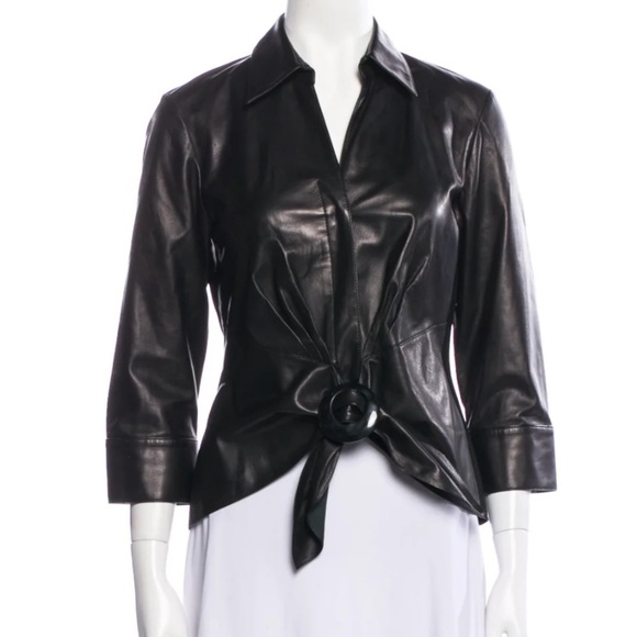 | Product Features | Three-quarter sleeved blouse with self belt & hidden button placket. The leather is very soft & thin like glove leather. Worn once & dry cleaned. Lafayette 148 Lamb Leather JacketBlackPleated Accents & Pointed CollarButton ClosureColor is a cross between black and chocolate brown Measurements Bust is 19" across & length is 23"Made with 100% lamb leather. Such a timeless classic look to add into your closet. No flaws, good preowned conditionQuiet luxury, unassuming, minimalist, rich, high end, city, well made, quality, designer | ||