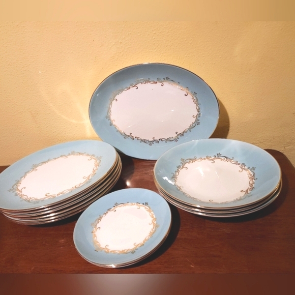 | Product Features | New Condition! Stored Carefully, Look Unused. Gold, white & turquoise. 12 Piece Total 6 Dinner Plates 10"1 Oval Serving Plate 11.5" x 9"3 Dessert Plate/Bowls 8"2 Saucers 6"Lifetime China in the Gold Crown pattern. Beautiful design in a white and blue China with a lovely gold scroll, leaf and flower design. The bottoms are all marked: LIFETIME CHINA CO. / SEMI-VITREOUS / ALLIANCE OHIO. / GOLD CROWN.1950s 1960s retro spring summer wedding bridal wedding gift present fancy elegant mcm mid century royal Hollywood Regency cottage cottagecore romantic Victorian holiday anniversary | ||