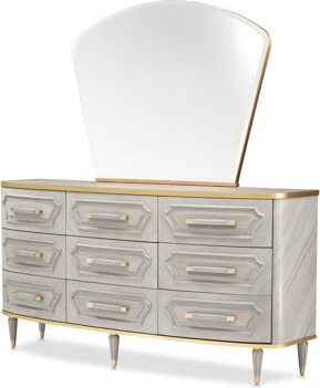 | Product Features | Details:The St. Charles dresser and mirror set embodies understated elegance and grandeur, blending traditional grace with modern sophistication. Crafted with a sen veneer in a dove gray finish, this luxurious dresser enhances your bedroom with style and functionality. A marble inlay on the top adds a touch of luxury, elevating the dresser's design and providing a sophisticated surface. A bronze frame and hardware complement the dove gray finish, providing a subtle yet striking contrast that enhances its overall elegance. Michael Amini | ||