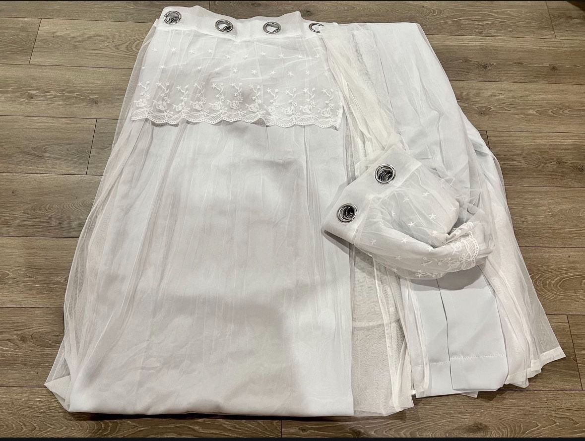 | Product Features | In like new conditions. Dove grey color with floral details on the outer tulle sheer panels. Includes 2 tulle sheer panels and 2 blackout panel of 52"Wx96"L each and 2 tie backs. Used lightly before we move and unfortunately the length doesn’t work with our new ceiling height. From pet free and smoke free home. Pick up in Puyallup. | ||