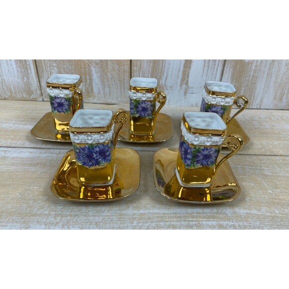 - Home >Dining >Drinkware > 5 Bone China Gold Encrusted Floral Square Demi-Tasse Cups & Saucers Germany