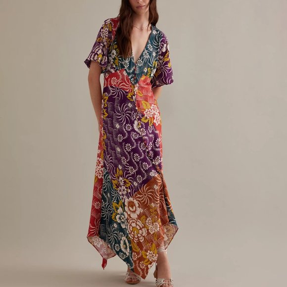 | Product Features | Size 0 HTF By Anthropologie Short-Sleeve V-Neck Button-Front Midi Dress featuring a colorful floral print featuring a handkerchief hem. NWT.- Viscose- Side zip- Hand wash- Handkerchief hemDimensions- Falls 47.75" from shoulder | ||