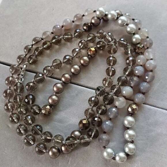 | Product Features | Stella & Dot glass, faux pearls NecklaceStella & Dot faceted beaded gray tone necklace with glass, smokey quartz, and faux pearls. 46” long. can double it up.lobster clasp closure.In excellent like new condition. | ||