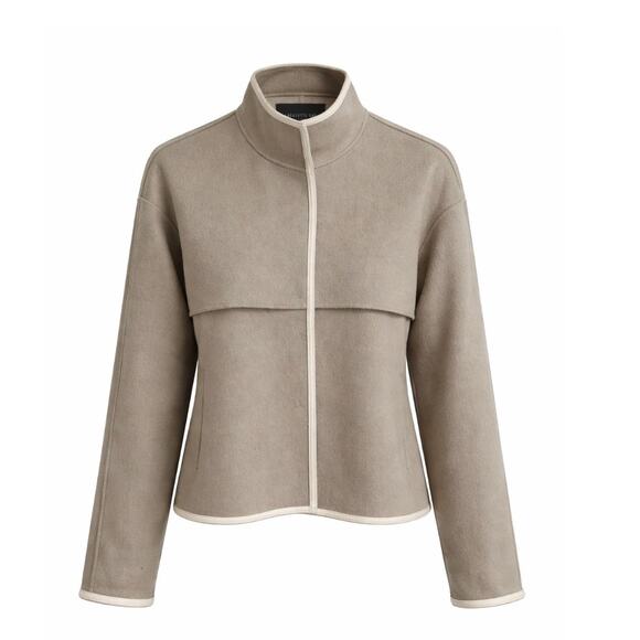 | Product Features | Lafayette 148 New York Wool & Cashmere Double-Faced Jacket Neutral Beige *Size is estimated, please see measurements below.Lafayette 148 New York luxury jacketSize: Petite (P) – fits like a Small PetiteNeutral taupe / stone beige with ivory contrast trimStructured wool-blend felt with smooth, dense feelModern minimalist silhouette with subtle shapingHip-length cut, perfect for work or elevated casual wearStand/mandarin collar for a polished lookClean front with concealed closure (no visible buttons)Long sleeves with straight cuffsDiscreet vertical side pocketsExcellent pre-owned condition, close up of fabric and wearFit note: Best for petites ~5'4" and under; sleeves and body are shorter than regular sizing.Measurements:Armpit to armpit: 19"Length down center back, from collar seam: 24" | ||