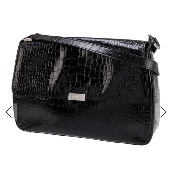 | Product Features | Ralph Lauren leather top handle bag in black with silver tone hardware. Features a single adjustable shoulder strap, a front flap closure, and one exterior pocket. Interior is finished with logo jacquard lining and dual interior pockets.Measurements: Height 8.5” | Width 12” | Depth 3” | Shoulder strap drop 9.75” | ||