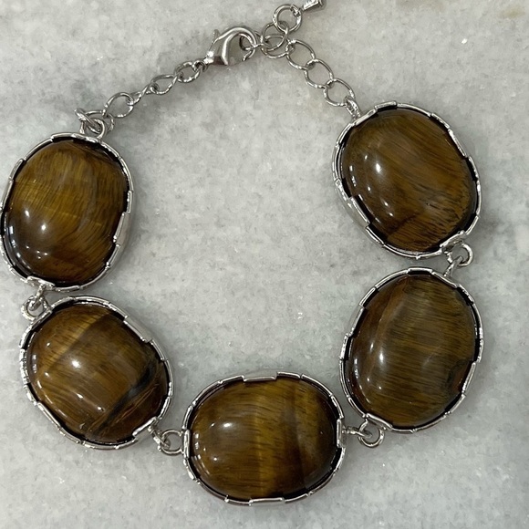| Product Features | Five LARGE Tiger’s Eye cabochon stones set in silvertone. Stones have a dark and light brown blend…just beautiful!Adjustable with extender. Fits 8-9” wrist | ||