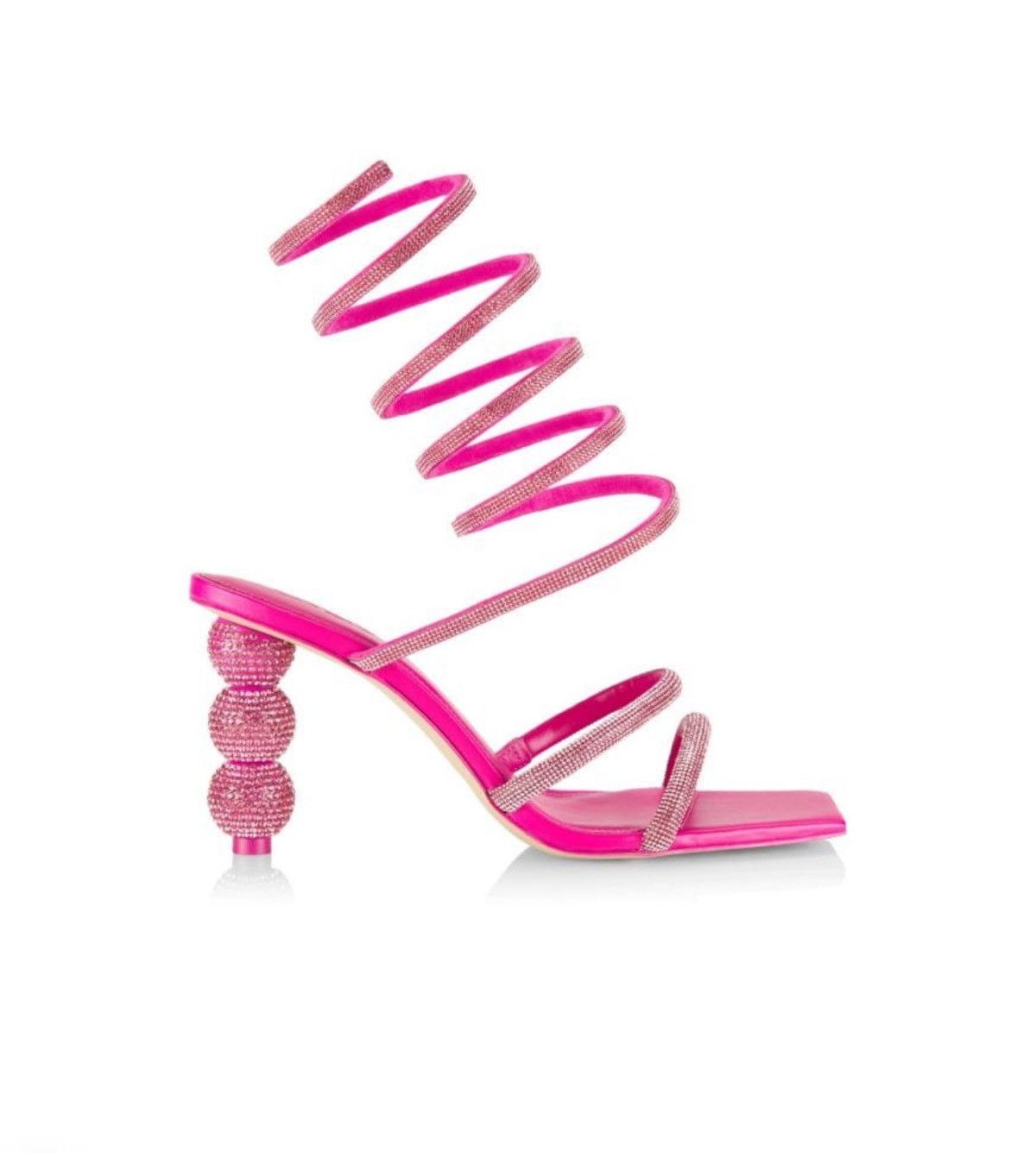 | Product Features | Seller DescriptionNever worn with box and extra pair replacement heel tips, size 39Cult Gaia's Lislie sandals sit atop a sculptural heel made of stacked spheres. This pair flaunts crystal embellishments and spiral straps.Textile & glass upperOpen toeAdjustable spiral strapLining:LleatherLeather soleImportedHeel height, 4" (102mm)Pink | ||