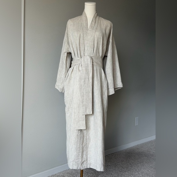 | Product Features | ✨A unique Kimono-Robe !!!Heavy - weight , premium linenKimono / duster style Dropped shouldersOverlapping front panels Relaxed, minimalist silhouetteTwo deep side pockets Bust pit to pit 23”, length 50”, sleeve 16”, belt width 3”One size: best fits M/L Oversized shouldersExcellent condition ! The quality of this brand is reminiscent of Elizabeth Suzann.Artisan coat / Heavy Linen / Timeless / Minimalist Chic / Boho coat / Neutral / Coastal / Cabincore / Rustic / Earthy | ||
