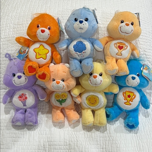 | Product Features | Lot of 7 vintage Care Bears plush. Perfect for cuddles and play.20th anniversary edition Lot includes:Share Bear (has light smudges)Friend Bear (no tags)Funshine BearLaugh-a-lot BearChamp Care Bear (light orange color)Champ Care Bear (blue color)Grumpy Bear (has light smudges)Please view photos for details, measurements, and condition as they are a part of the description. Measurements are from flat lays and are approximate. “Pinch” the photos to get closeups of the details. Ask questions before purchase. Thank you! | ||