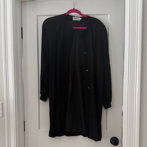| Product Features | Elevate your style with this sleek black leather jacket from Adrienne Vittadini. Perfect for any occasion, this jacket offers a timeless look with its classic design.Simply elegant black suede button down coat.Worn once.Very special piece. | ||