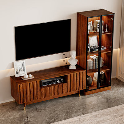 | Product Features | Details:Such a cabinet set is a great way to complete your living room space. Inspired by traditional mid-century designs, this eye-catching entertainment center is sure to be the star of any ensemble you set it in. Featuring a TV stand and a glass display, each piece is founded atop four slanted legs and features a clean-lined frame crafted of brown-finished solid wood and laminated manufactured wood.Bring a splash of color and lots of elegance to your living room with this mid-century modern Entertainment Center that complements any decor style. The rich, warm walnut finish pairs perfectly with leather sofas, velvet armchairs, or minimalist decor accents, making it a stylish focal point for your space. Say goodbye to bland entertainment centers, here's the perfect blend of modern and vintage. George Oliver | ||