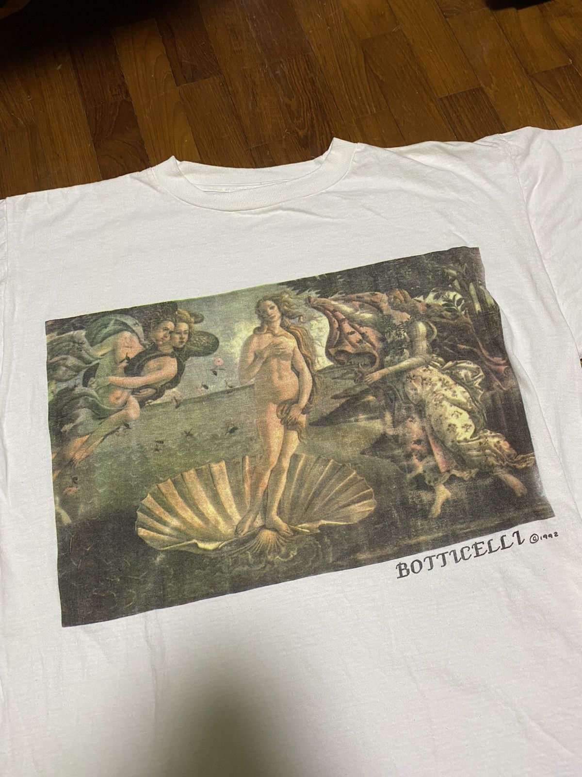 | Product Features | Seller DescriptionRARE Vintage Early 90’s Botticelli The Birth of Venus Painting Art Tee from 1992Lightly used condition, refer to picturesFits a size L - XL (request for measurements)Made in USASingle stitched all overFaded tagThe Birth of Venus is a painting by the Italian artist Sandro Botticelli, probably executed in the mid 1480s. It depicts the goddess Venus arriving at the shore after her birth, when she had emerged from the sea fully-grown (called Venus Anadyomene and often depicted in art). The painting is in the Uffizi Gallery in Florence, Italy.Although the two are not a pair, the painting is inevitably discussed with Botticelli's other very large mythological painting, the Primavera, also in the Uffizi. They are among the most famous paintings in the world, and icons of Italian Renaissance painting; of the two, the Birth is better known than the Primavera.Check out my other listings for more vintage heat (starting at $20), rare jerseys, archive/designer/luxury pieces and obscure sneakers!!WhiteVintage | ||