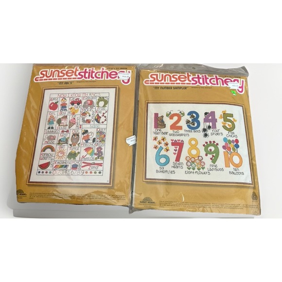 | Product Features | Vintage Sunset Stitchery Needlepoint Kit Lot – ABC & Number SamplersSet of two vintage Sunset Stitchery needlepoint kits, both factory sealed and unopened.Includes:• My ABC's sampler• My Number Sampler (1–10)Perfect for collectors, vintage craft lovers, or a nostalgic nursery/child's room project. Kits appear complete and unused, still sealed in original packaging. Please see photos for exact condition and details.✔ Vintage needlepoint✔ Sunset Stitchery brand✔ Sealed / new old stock✔ Sold as a setShips carefully packaged from a smoke-free home. | ||