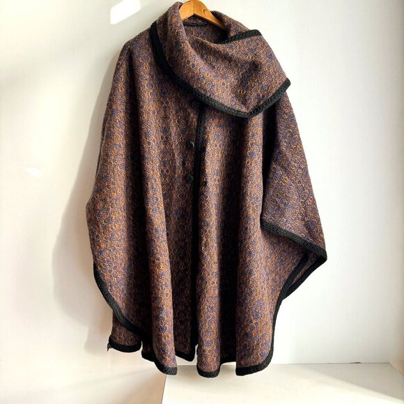 Vintage wool Borw Blue Woven Button Closure Neck Detail Cape OS