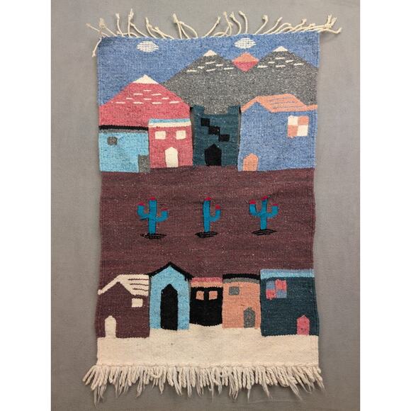 Southwestern Rug Wall Hanging Hand Loomed Woven Landscaping 42x28 Town Scene
