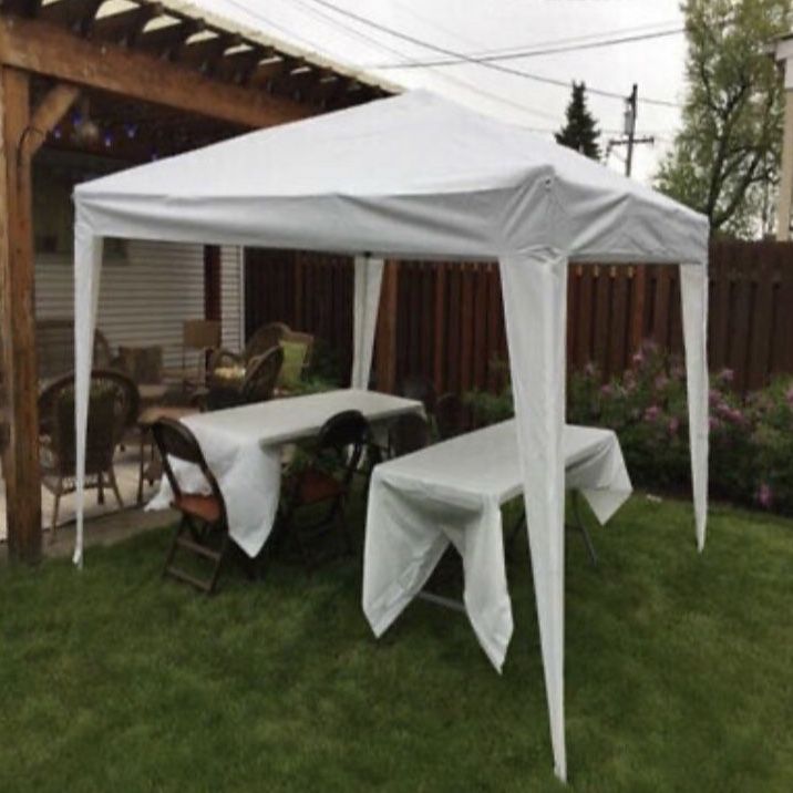 | Product Features | Brand new in boxAvailable for pick up in CoronaOur dressed leg canopy is perfect for any event when you want that extra elegant look. Portable and easy to take up and down in just minutes. Features:* Includes frame, top, carry bag, rope and spike kit* Available in White with Leg Skirts* 210 Denier Polyester Fabric* Leg Skirts have elastic straps with hooks to secure to the frames legs* Lightweight Recreational grade frame* Canopy kit weight: 28 lbs.* Carry Bag included for easy transportIMPORTANT NOTE:Canopies ARE NOT to be left unattended as they are considered temporary shelters! If there is inclement weather, you should take your canopy down immediately. Any rain and winds over 10-15 MPH will damage your canopy. Water that collects on the canopy top will also destroy the structure of your canopy.We advise you to NEVER leave a canopy tent set up overnight and unattended during inclement weather conditions. We will not be held responsible for ANY weather damages. It is to the customer’s best judgment in determining the best weather conditions for your canopy. | ||