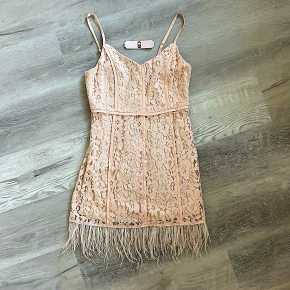 | Product Features | Brand new with tags and unworn lace dress with feather trim by GB. | ||