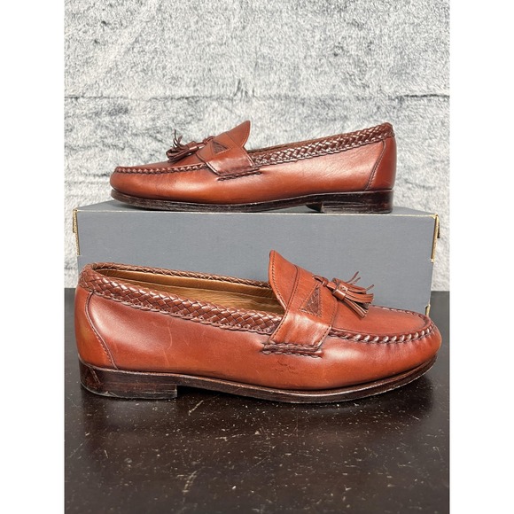 | Product Features | Brand: Allen EdmondsModel: Maxfield tassel loafers in brown leather with braided trim and moc toe styling.What it is: Mens slip-on dress shoes with tassels and woven detailing around the collar and vamp.Color: BrownMaterials: Leather upper, leather lining and insole, leather outsole with rubber heel caps.Country of manufacture: Made in USA of imported materials (per insole stamp).Size on tag: US Mens 10.5 B (inside code reads 10 1/2 3B 47716 26307).Style/Model code: 47716; additional code: 26307.Details: Slip-on design, tassel and braided detailing, stitched moc toe, low stacked heel, classic dress loafer style suitable for business, office, or smart casual wear.Special notes: Original box not included; listing is for shoes only. | ||