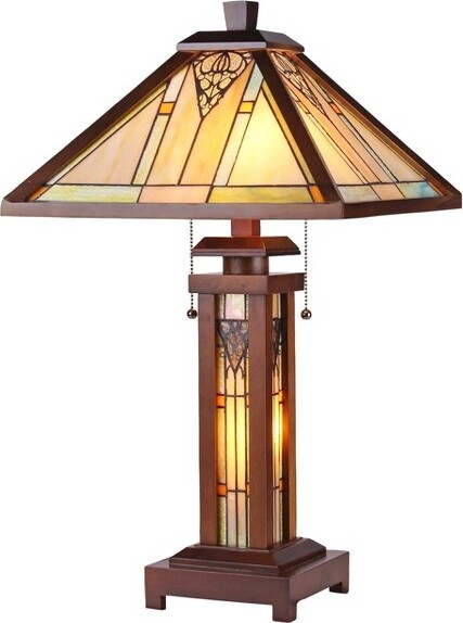 | Product Features | Details:Bring refined mission-style elegance to your space with the Zella Tiffany-style double lit table lamp. This exquisite lamp showcases a handcrafted geometric shade in earthy tones of green, red, white, and deep brown, inspired by classic Mission and Arts & Crafts aesthetics. Key Features- Mission-style double lit lamp with multi-tone Tiffany-glass in green, white, red, and dark brown. Handcrafted from 148 pieces of stained art glass , showcasing classic geometric design. (2) E26 60W max Type A bulbs + (1) E12 25W base bulb provide layered lighting control (Type A bulbs not included). Square 15" stained glass shade with a solid wood base in a dark walnut finish. Dimensions- 25.6" H x 15" W x 15" D; Weight- 8.64 lbs. | ||
