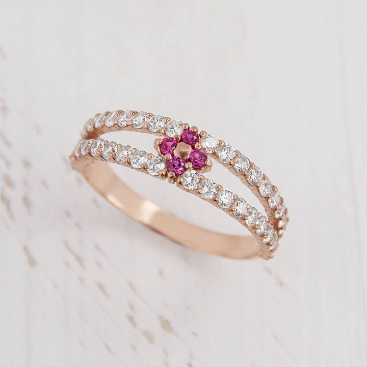 | Product Features | Details:Ruby band, Ruby ring, Ruby wedding ring. This stunning rose gold ring features a unique double-band design, each band adorned with a row of sparkling white cubic zirconia. At the center, a cluster of vibrant rubies forms a delicate floral accent, adding a touch of bold color & elegance to the piece. The warm rose gold setting beautifully complements the crimson rubies & white zirconia, creating a timeless look with a modern twist. Ideal for special occasions or as a unique statement piece, this ring embodies sophistication & charm. Ring information: Main stone: Ruby Approximate size: 1.75mm (4 stones) Accent Stone: White cubic zirconia Approximate size: 1.5mm (40 stones) Metal type: Gold Metal stamp: 14k Gold Installment Payments We offer installment payments for an unlimited period for absolutely all products from our store. If you want to change the terms of installments, please contact us. We can propose many different variantions of it. Customization / Replacements You able to choose this ring from different variations: - silver+cz ( ring in 925 sterling silver with cubic zirconia (synthetic stones) same color which you see on pictures ) - rose gold filled+cz ( ring in 925 sterling silver filled with rose gold with cubic zirconia (synthetic stones) same color which you see on pictures ) - silver+ gems ( ring in 925 sterling silver with with genuine gemstones same color which you see on pictures ) - rose gold filled+ gems ( ring in 925 sterling silver filled with rose gold with with genuine gemstones same color which you see on pictures ) - 14k rose gold+cz ( ring in 14k rose gold with cubic zirconia (synthetic stones) same color which you see on pictures ) - 14k white gold+cz ( ring in 14k white gold with cubic zirconia (synthetic stones) same color which you see on pictures ) - 14k yellow gold+cz ( ring in 14k yellow gold with cubic zirconia (synthetic stones) same color which you see on pictures ) - 14k rose gold+gems ( ring in 14k rose gold with genuine gemstones same color which you see on pictures ) - 14k white gold+gems ( ring in 14k white gold with genuine gemstones same color which you see on pictures ) - 14k yellow gold+gems ( ring in 14k yellow gold with genuine gemstones same color which you see on pictures ) - 18k rose gold+cz ( ring in 18k rose gold with cubic zirconia (synthetic stones) same color which you see on pictures ) - 18k white gold+cz ( ring in 18k white gold with cubic zirconia (synthetic stones) same color which you see on pictures ) - 18k yellow gold+cz ( ring in 18k yellow gold with cubic zirconia (synthetic stones) same color which you see on pictures ) - 18k rose gold+ gems ( ring in 18k rose gold with with genuine gemstones same color which you see on pictures ) - 18k white gold+ gems ( ring in 18k white gold with genuine gemstones same color which you see on pictures ) - 18k yellow gold+ gems ( ring in 18k yellow gold with with genuine gemstones same color which you see on pictures ) Also it can be made with | ||