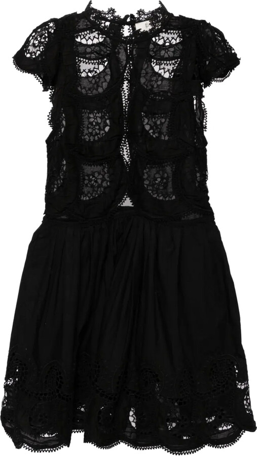 | Product Features | Details:black cotton rear button fastening lace trim semi-sheer construction round neck two side inset pockets | ||