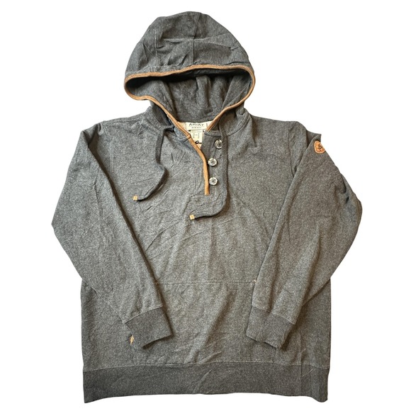 | Product Features | Brand: Ariat (REAL line)Item: Womens pullover hoodieColor: Gray with tan contrast trimTag size: Womens XLStyle/Model: REAL Elevated HoodStyle code on tag: 4500115Additional tag code: CH28 F2Features: Drawstring hood with 3-button henley placket (Ariat-branded buttons)Features: Kangaroo front pocket with contrast trimFeatures: Leather-look Ariat logo patch on sleeveFeatures: Ribbed cuffs and hem; soft brushed interiorMeasurements (from photo notes): Pit to pit 46 inches; Length 26.5 inches; Arm length 22.5 inchesNotes: Visible brand labels read "ARIAT REAL" and "REAL Elevated Hood." | ||