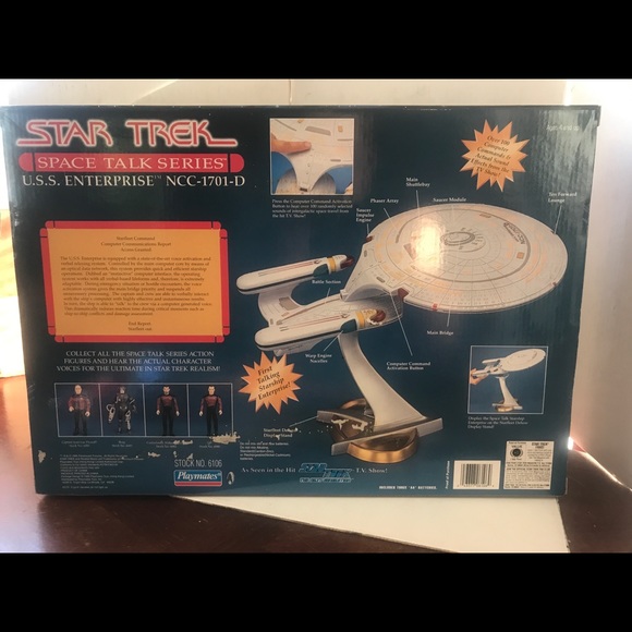 | Product Features | 1995 Playmates Star Trek Space Talk Sdries U.S.S. Enterprise NCC-1701-D, First Talking Starship Enterprise, over 100 Randomly Selected Computer Commands & Actual Sound Effects From The T.V. Show, Starfleet Deluxe Display Stand Included, Bonus: Technical Blueprint Inside, Collector's Edition No. 027388 Stock No. 6100, I GotThis Toy In Aution, The Try Me Botton not Working, Not Tested The Box Is Sealed, Please Cosider Before Takke Any Decision. Thanks. | ||