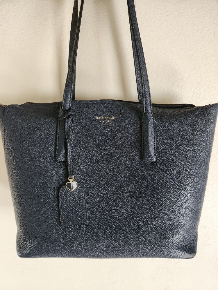 | Product Features | The Kate Spade Margaux Parisian Navy Leather Large Tote is a stylish and versatile handbag perfect for various occasions, including travel, weddings, parties, formal events, work, and casual outings.Made of high-quality leather with a pebbled finish, this trapezoid-shaped tote features a zipper closure, double black leather handles with a 9.5" drop, gold-plated hardware accents, and a charming bag charm.The navy blue exterior color adds a touch of elegance, making it a classic yet trendy accessory for any woman's wardrobe.In great condition. Has some peeling on the side top as shown in pictures. Pen markings inside as shown as well. Any defects are shown. But overall a great purse!⚠️Be a gem! Go check out my other listings on my page! 💎 | ||