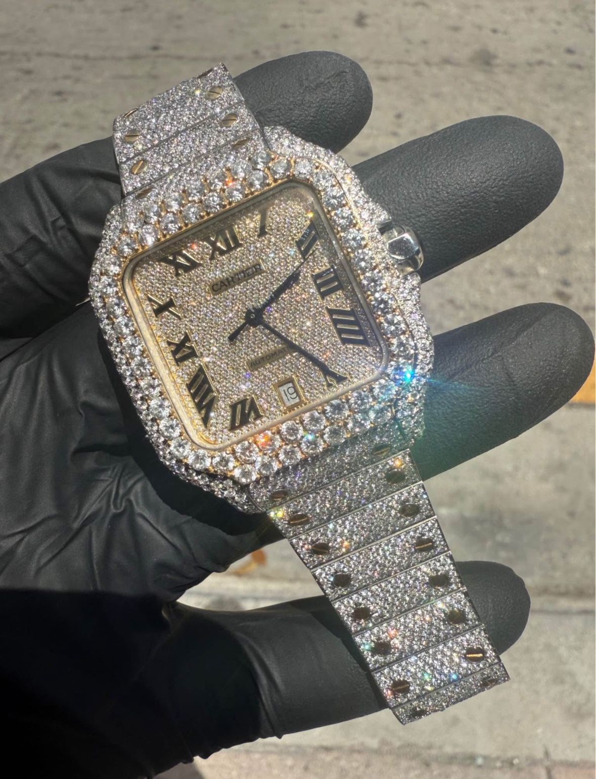 | Product Features | Aftermarket two tone Cartier 41mm Big bezel moissanite diamondsBustdown Natural VS Flower setting Box | ||