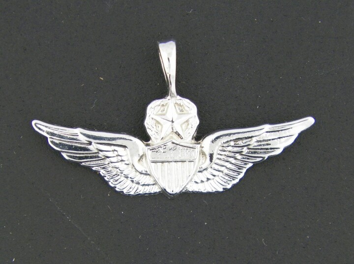 | Product Features | Details:White Gold Army Aviation Master Wings. These can be made in Yellow Gold please specify. The wing is approximately 1 1/4" wide. Master Aviator Pendant 1.25" 14Kt White Gold | ||