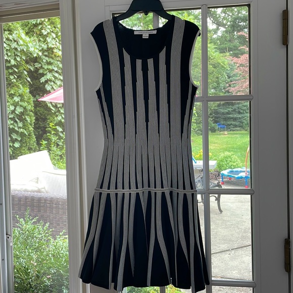 | Product Features | Gorgeous never worn DVF sleeveless dress. Diane Von Furstenberg Black And White Knit Body Con Dress With Flared Skirt. Size small. | ||