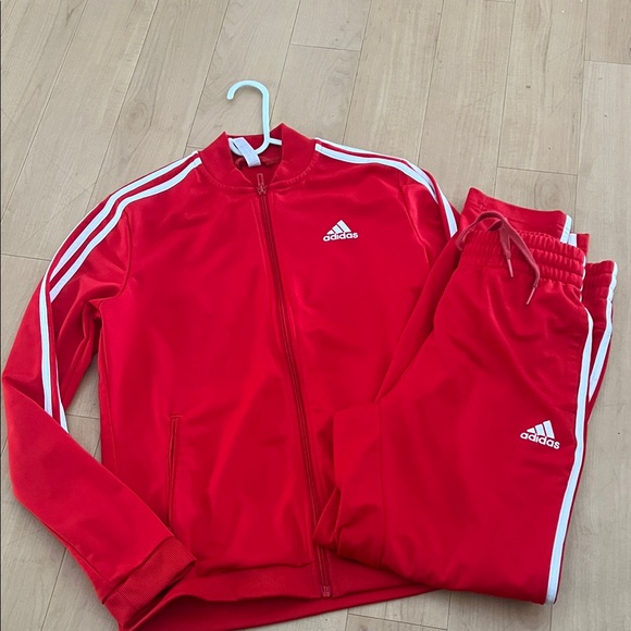 | Product Features | Bold red Adidas tracksuit with signature white stripes. Includes zip-up jacket and matching pants.Preloved but in excellent condition My son outgrew it Both Jacket and pants size small Inseam is 28” Jacket PTP 19”No grass stains | ||