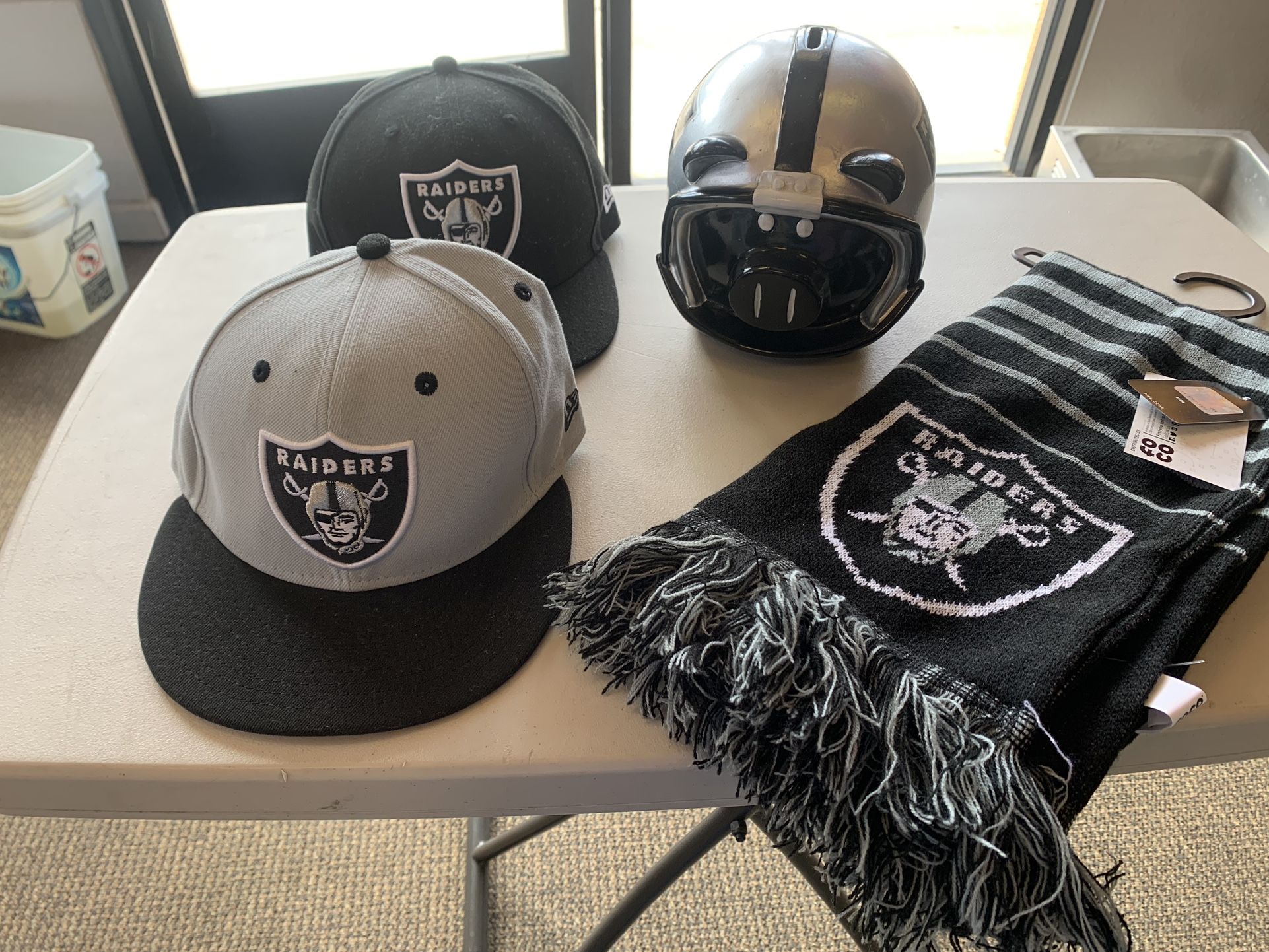| Product Features | 2 caps size 71/8 from new era brand 1 piggy bank 1 raiders scarf Everything in good condition clean no damage | ||