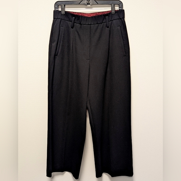 | Product Features | Maliparmi Black Pleated Minimalist Wide Leg Trousers Women's 44 US 8.Timeless and refined Maliparmi black trousers with a clean, minimalist silhouette. Designed with front pleats and a flattering wide-leg cut, these pants offer effortless elegance with a tailored feel. A versatile wardrobe staple that transitions seamlessly from workwear to elevated everyday styling.Maliparmi black wide leg trouserswith front pleats, side pockets, belt loops, and one rear slip pocket.Minimalist / tailored aestheticPull-on or structured waistband (as shown)Quality ponte knit type fabric Classic black color makes them easy to dress up with heels or down with flats or loafers. Perfect for capsule wardrobes, minimalist aesthetics, or modern chic.Excellent pre-owned condition with no noted flaws.15" (30" waist)14" front rise 23" inseamCorpcore, boardroom chic, business meeting, professional, contemporary, lawyer, chic | ||