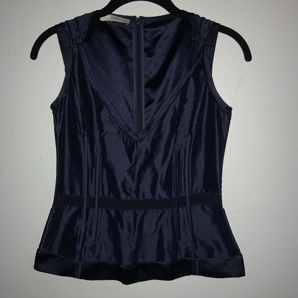 | Product Features | This fitted Prada blouse in a rich blue hue features a sleeveless design and a bustier style that accentuates the waist. The peplum flare adds a touch of elegance, while the V-neckline enhances its sophisticated appeal. Crafted from a silky fabric with a subtle sheen, it offers a chic and structured silhouette. | ||