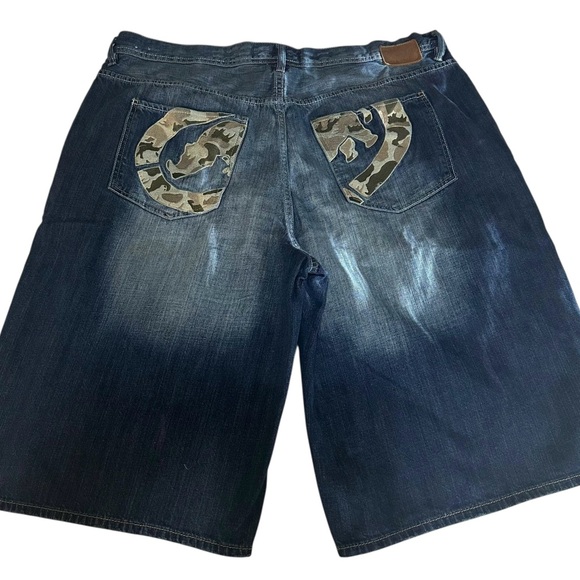 | Product Features | These Ecko Unlimited jeans combine a striking green and blue camouflage pattern with classic denim for a bold, modern look. The unique design offers a fresh twist on traditional jeans, making them a standout choice for any casual occasion. Crafted with attention to detail, these jeans ensure both style and comfort. These vintage shorts are pre-loved in wearable condition. The flat measurements are 16 waist and 21 inches long. The inseam is 11.5 . The measurements are approximate and may vary depending on the technique used to measure. | ||
