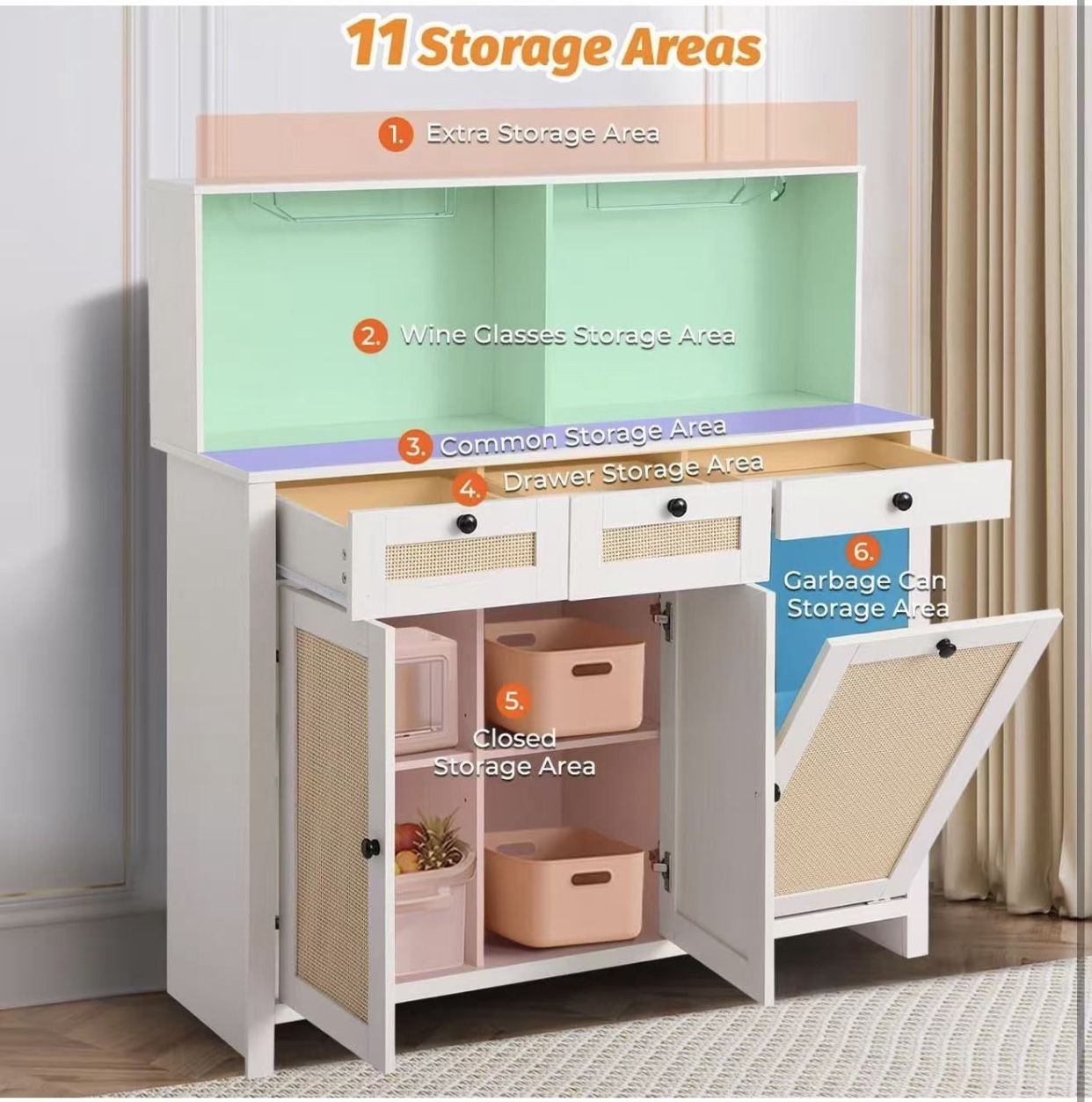 | Product Features | Great storage cabinet! White with wicker details, has 3 drawers and 2 doors with shelves inside. Top section has 2 open shelves. Also has a hidden garbage can storage and adjustable LED light that changes color. Dimensions: 47.3'' wide, 50'' tall, 15'' deep. | ||