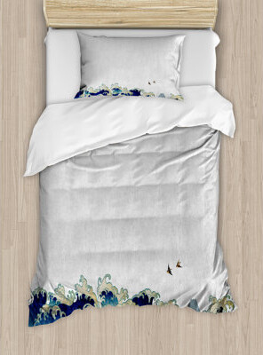 - Home & Living >Bedding >Comforters & Duvets >Duvet Cover > Ambesonne Wave Aquatic Swirls Flying Birds of Ocean Ukiyo-e Style Artwork Grunge Print Duvet Cover Set