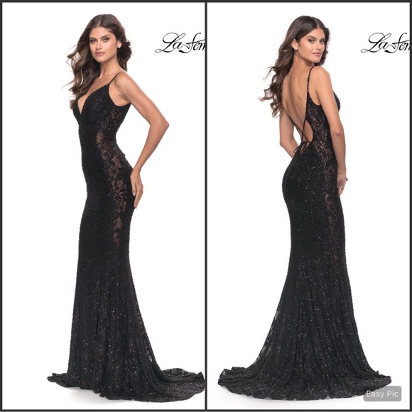 | Product Features | -New with tagsRetail: $558Details:La FemmeSize: 00Color: BlackSleeveless Body Fitted Column Shape Stone Decorated Alluring Long Dress by La FemmeMake the moment memorable in this dramatic dress designed by La Femme 31257. This dress has a deep V-neckline and is supported by thin spaghetti straps. It is a close-fitting dress that emphasizes the feminine figure and gives you a fiery look. The dress has a floor-length fishtail silhouette and a train at the end. It is also decorated with stones.Approximate Measurements:Length: 60"Underarm to underarm: 15-16"”Across waistband: 11”Across hips: 16.5"Influencer Statement Piece, bridesmaids, black tie, gala, formal wear, prom, homecoming, pageant, wedding guest, bridal, wedding, bridal shower, mother of the bride, mother of the groom, rehearsal dinner, bachelorette, pageant, prom, homecoming, wedding, engagement photos, special occasion, little black dress, gala, Graduation, holiday parties, pageant, Quinceañera, formal, black tie, cocktail, Maid of honor, Special occasion, Designer Event, Dinner gown, Photo shoot, Formal event, Celebrity Red Carpet Luxe Luxury, Holiday, Vacation Resort wear, Beach dress, Spring, Summer, Fall, Ballgown, Gown | ||