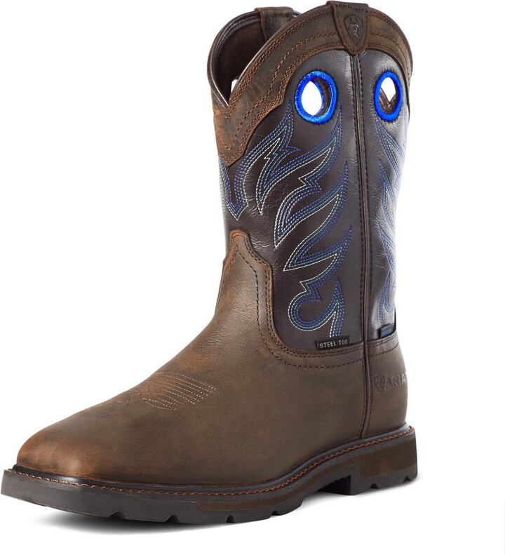 | Product Features | Details:DELIVERS STABILITY & SUPPORT: Take a break from uncomfortable work boots. The Groundbreaker collection pairs just-right cushioning with versatile traction for an all-around boot that's best for construction, factory, warehouse, or farm and ranch work. WATERPROOF CONSTRUCTION: Ariat DRYShield waterproof breathable construction is designed with waterproof full-grain leathers and an impermeable barrier to deliver trusted durability and dry feet. STEEL TOE FOOTWEAR: These work boots for men meet ASTM F2413 standards for safety toe protection and electrical hazard-resistant footwear . They feature a cement construction for durability and follow ASTM F3445 standards for slip resistance. THE SUPPORT YOU NEED: The Duratread outsole is oil- and slip-resistant and passes hot contact tests at 300°C/572°F. Built for the working man, these men’s boots provide support, a 90-degree heel, and traction on various surfaces. ALL-DAY COMFORT: These leather boots for men feature 4LR technology that provides lightweight support and stability. The removable All Day Cushioning insole maximizes your comfort while on the job. | ||