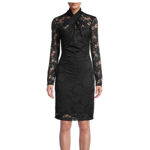 | Product Features | Never worn with tag.Size 4Retail for $225Crafted of delicate lace, this knee-length dress features a twist-accented mock turtleneck and long sleeves.Mock turtleneckLong sleevesZip back92% nylon/8% woven 215 gsmMachine washImportedAbout 38" from shoulder to hem | ||