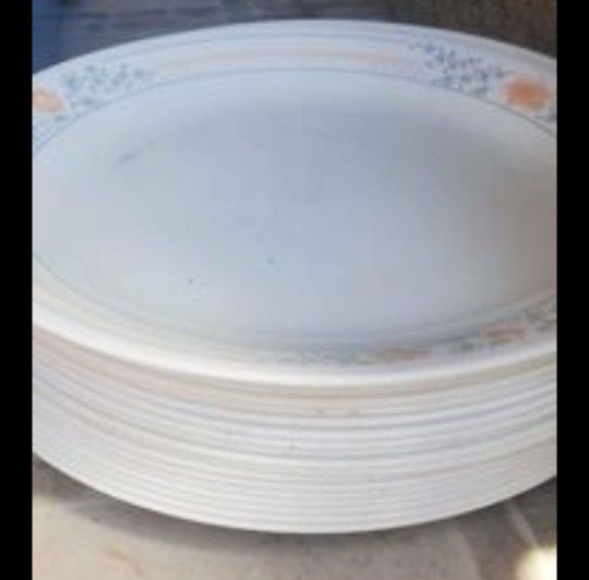 Product Features Vintage Dinnerware, Milk Glass Tableware, Aprokot Grove Corelle By Corning 80'sThis sale includes 17 dinner plates.The pattern features peach flowers with smaller gray flowers with gray peach and gray pin stripes.No chips, cracks or chewed edges.Faint utensil markings may be present.Expect normal to light wear for age and use. This is vintage and each plate goes for $10-30 on Ebay/easy, etc.