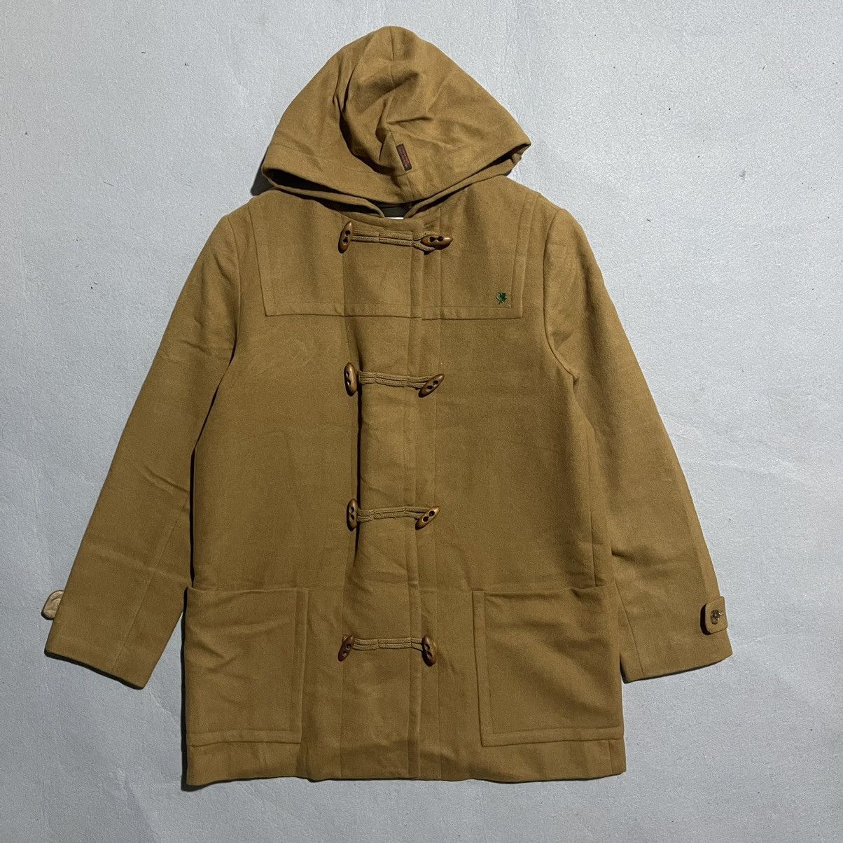 | Product Features | Seller DescriptionMademoiselle NON NON, a sub-line of celebrated Japanese designer Né-net Issey Miyake alumnus Hiroko Koshino, is known for refined craftsmanship and elevated everyday wear. This coat embodies understated Japanese elegance with premium fabrics and timeless design.Features:•Materials: Outer shell crafted from 60% angora / 40% wool, offering a soft yet structured hand-feel; fully lined in 52% cupro / 48% polyester for smooth layering.•Style/Design: Classic duffle/toggle coat silhouette with wooden toggles, concealed buttons, and clean tailoring.•Color: Warm camel brown with tonal lining.•Construction: Structured shoulders, adjustable sleeve tabs, large front pockets, and a roomy hood.•Functionality: Lightweight yet insulating due to the angora blend, ideal for cool seasons.•Sizing: Chest 21” / Length 30” / Shoulders 17” / Sleeves 24” / Waist 22”•Origin: Made in Japan•Condition: Great vintage condition; minimal signs of wear.A refined Japanese vintage coat with a luxurious angora-wool blend, perfect for collectors or those seeking a timeless outerwear staple.B68BrownVintage | ||