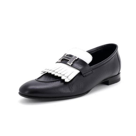 | Product Features | These are professional pictures of the actual item offered by Rebag.Condition: Very good.Creasing and scuffs throughout, discoloration and marks in interior, peeling, discoloration, scuffs, and indentations on outer soles, scratches on hardware.Accessories: Dust BagDesigner: HermesModel: Women's Royal Loafers LeatherExterior Material: LeatherExterior Color: Black, WhiteInterior Material: LeatherInterior Color: BlackHardware Color: PalladiumItem Number: 379230/2 | ||