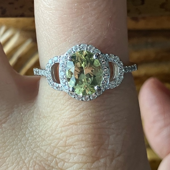 | Product Features | This pretty ring is made with genuine, earth mined canary apatite from Mexico and natural white zircons from Tanzania. Zircons are earth mined gemstones. They are not the same as cubic zirconia, which is a man-made stone. The total gemstone carat weight on the ring is 1.72. The ring is set in solid .925 sterling silver with a rhodium plate to prevent tarnishing. The ring in the photos is the actual one you will receive, so please see photos for quality and measurements. Size 10.Inventory: J3 | ||