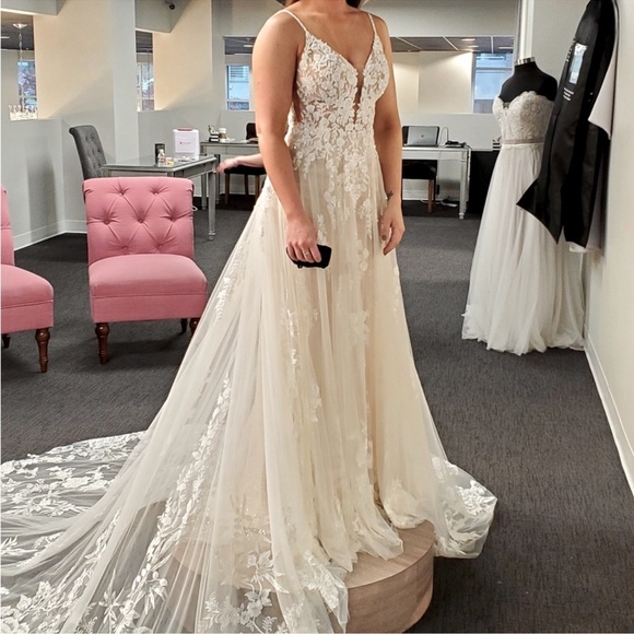 | Product Features | Stunning lace, ivory and honey underlay Size 8 - reference size. Normal dress size 4BRAND NEW - Never worn - Never alteredSadly she didn’t get her chance to walk down the aisle. She deserves her moment! | ||