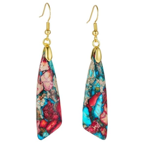 18K Yellow Gold with Natural Imperial Red Blue Jasper Stone Drop Hook Earrings